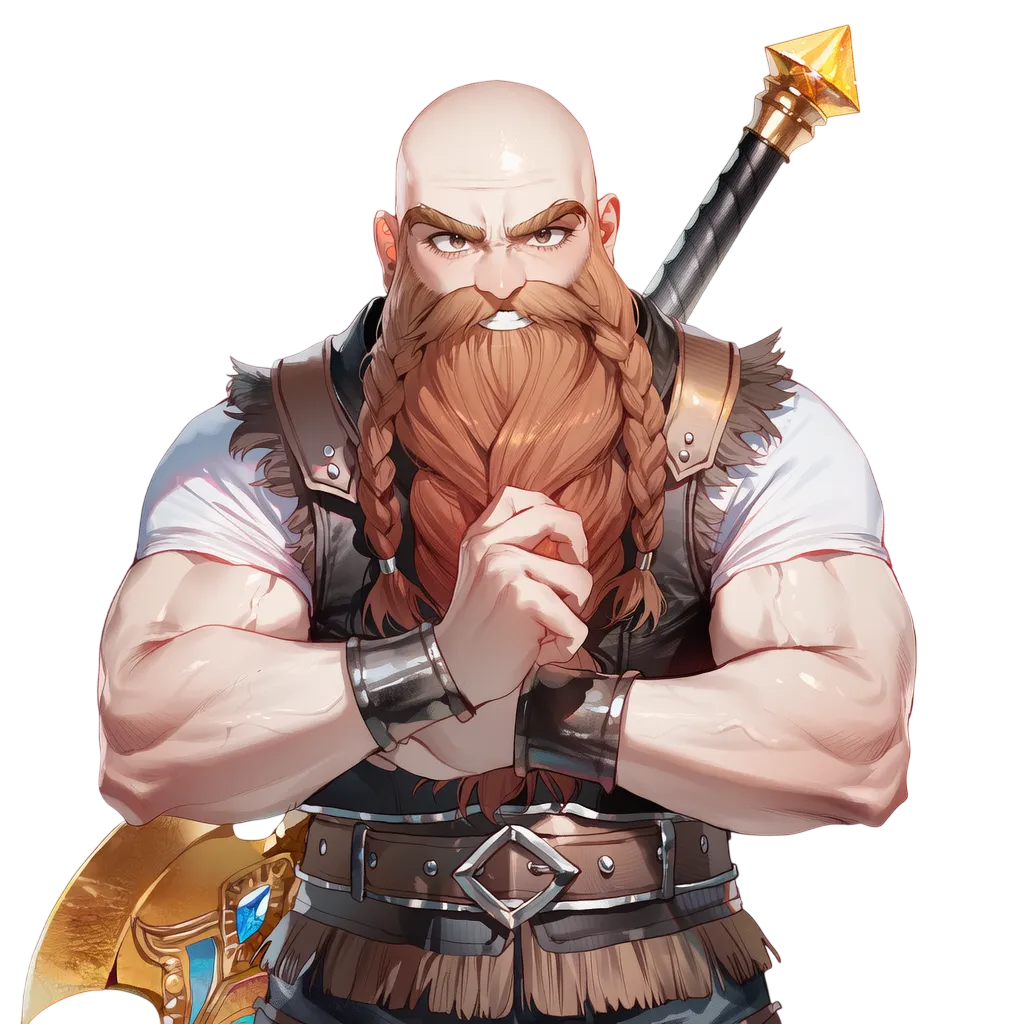 대머리, 수염, 거구 (드워프). 호탕함, 실용주의.